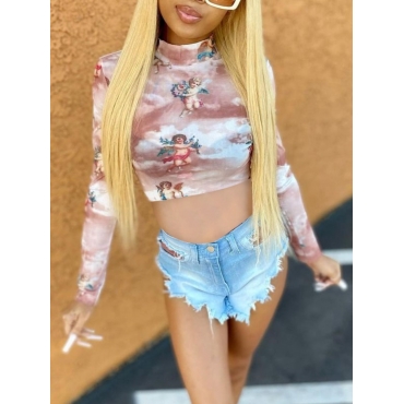 Lovely Chic Cartoon Print See-through Apricot T-shirt