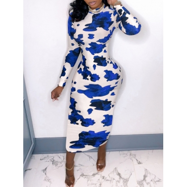 Lovely Casual Camo Print Patchwork Blue Mid Calf Dress