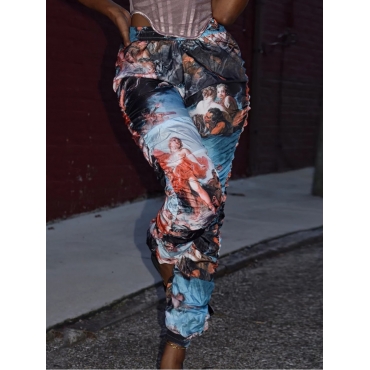 Lovely Street Print Patchwork Fold Design Blue Pants