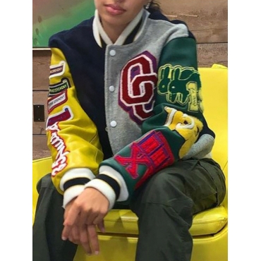 Lovely Street Letter Print Patchwork Deep Blue Jacket