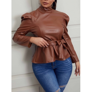 Lovely Formal Turtleneck Bow-tie Decoration Brown Blouse