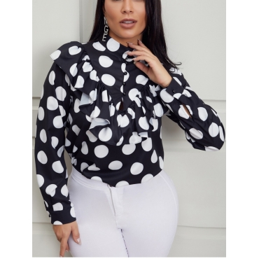 Lovely Stylish Flounce Design Dot Print Patchwork Black Blouse