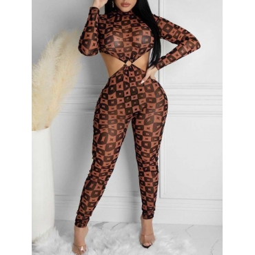 Lovely Sweet Geometric Print Hollow-out Brown One-piece Jumpsuit