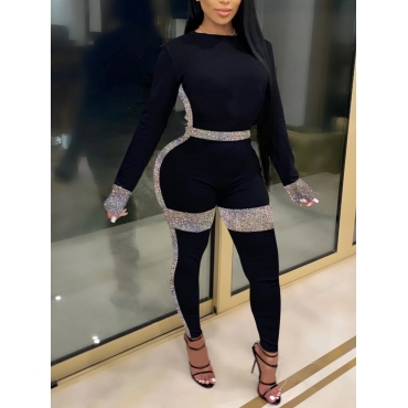 Lovely Chic Sequined Patchwork Black Two Piece Pants Set