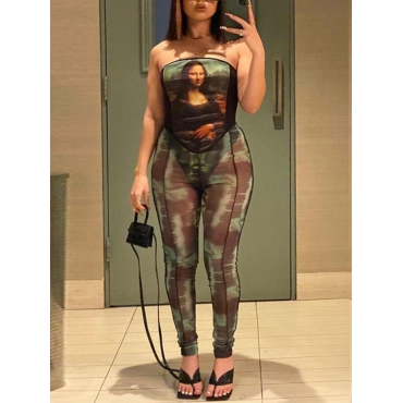 Lovely Sexy Bateau Neck Portrait Print Patchwork Black Two Piece Pants Set