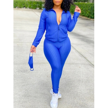 Lovely Sportswear Turndown Collar Zipper Design Blue Two Piece Pants Set(Without Mask)