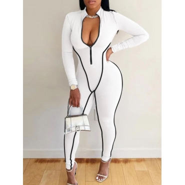 Lovely Sportswear Patchwork Zipper Design White One-piece Jumpsuit