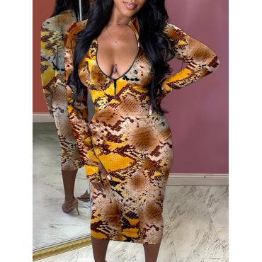 Lovely Casual V Neck Snake Print Mid Calf Dress