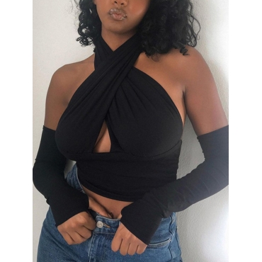Lovely Street Hollow-out Cross-over Design Black T-shirt