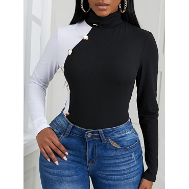 Lovely Chick Patchwork Button Design Black And White T-shirt