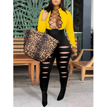 Lovely Trendy Ripped Bandage Hollow-out Design Patchwork Yellow One-piece Jumpsuit