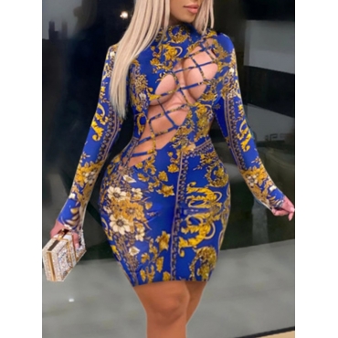 Lovely Sexy Floral Print Bandage Hollow-out Design Blue Knee Length Plus Size Dress