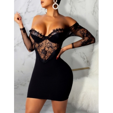 Lovely Sexy V Neck Off The Shoulder Lace Patchwork Black Mini Dress