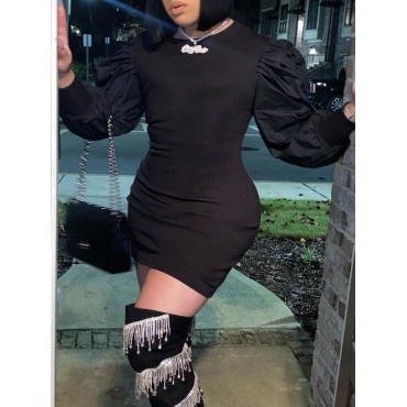 Lovely Casual Hubble-bubble Sleeve Print Black Mini Dress