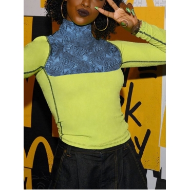 Lovely Street Turtleneck Print Patchwork Yellow T-shirt