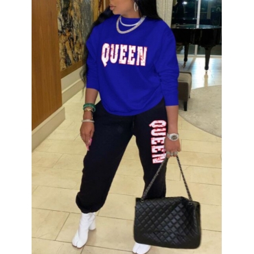 Lovely Casual O Neck Letter Print Blue Two Piece Pants Set