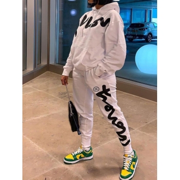 Lovely Street Hooded Collar Letter Print White Two Pants Set