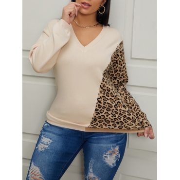 Lovely Trendy V Neck Leopard Print Patchwork Khaki Sweater