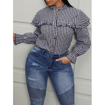 Lovely Stylish Grid Print Flounce Design Black And White Blouse