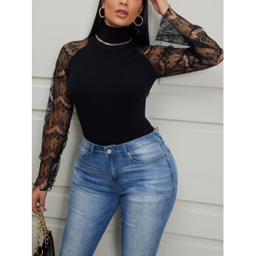 Lovely Trendy Turtleneck Lace Patchwork Black Sweater
