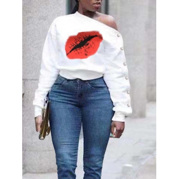 Lovely Casual Lip Print Button Design White Plus Size Hoodie