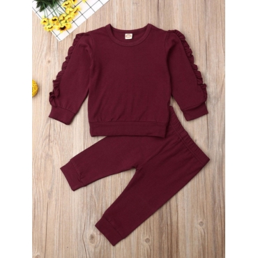 Lovely Casual Flounce PatchworkWine Red Girls Two-piece Pants Set