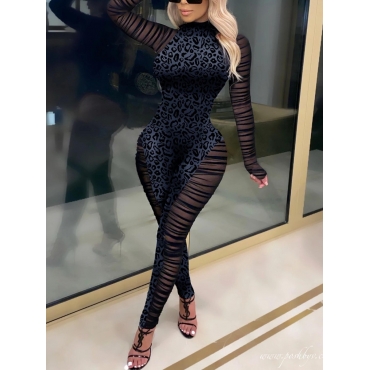 Lovely Sexy Leopard Print Mesh Patchwork Black One-piece Jumpsuit