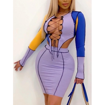 Lovely Sexy Patchwork Lace-up Hollow-out Purple Two Piece Skirt Set