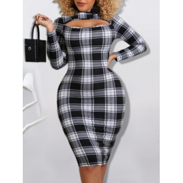 Lovely Formal Hollow-out Plaid Print Patchwork Black Knee Length Dress