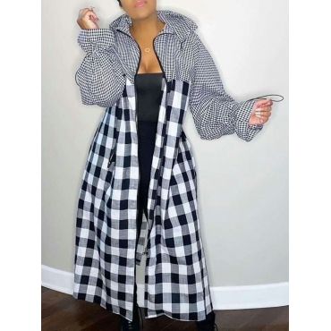 Lovely Stylish Hooded Collar Grid Print Black And White Trench Coat