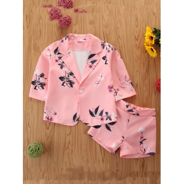 Lovely Stylish Turndown Collar Plants Print Pink Girl Two-piece Shorts Set