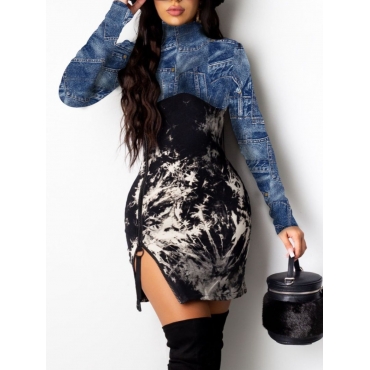 Lovely Stylish Turtleneck Print Patchwork Black Mini Dress