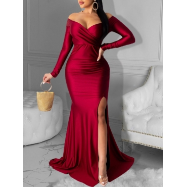 Lovely Party Dew Shoulder Side Slit Red Maxi Dress