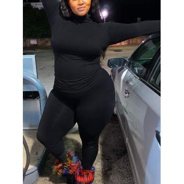 Lovely Casual Turtleneck Basic Skinny Black Plus Size Two-piece Pants Set