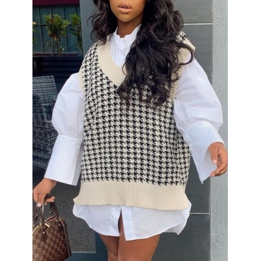 Lovely Street Plaid Patchwork Loose Black Mini Shirt Dress