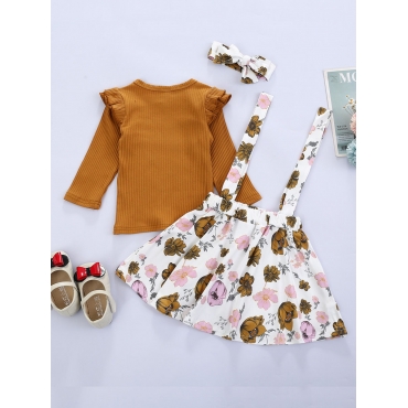 Lovely Trendy O Neck Floral Print Brown Girl Two-piece Skirt Set