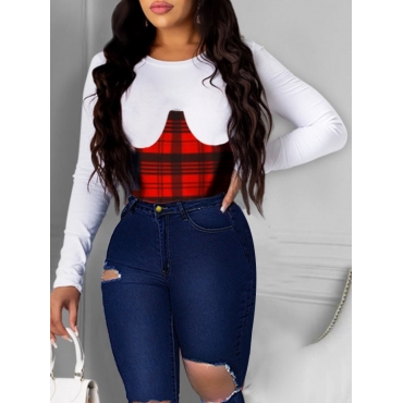 Lovely Sweet Plaid Print Patchwork Red T-shirt