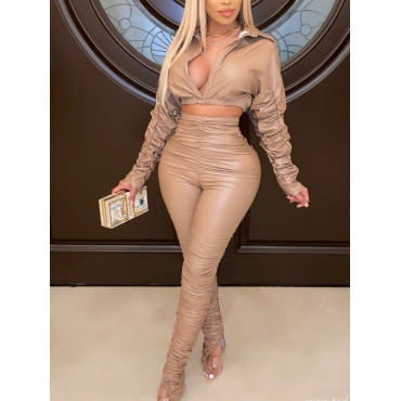 Lovely Street Dropped Shoulder Fold Design Khaki Two Piece Pants Set