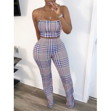 Lovely Sexy Spaghetti Strap Grid Print Blue Two Piece Shorts Set(Batch Grid Print)