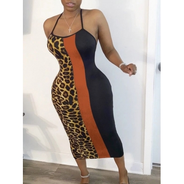 Lovely Sexy Spaghetti Strap Print Patchwork Black Mid Calf Dress