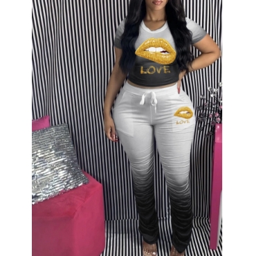 lovely Sportswear O Neck Print Fold Design Black Plus Size Two-piece Pants Set