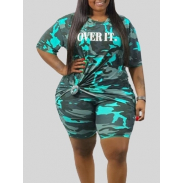 lovely Leisure O Neck Camo Print Blue Plus Size Two-piece Shorts Set