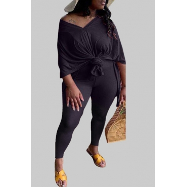 lovely Leisure V Neck Basic Black Plus Size Two-piece Pants Set