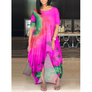 Lovely Casual O Neck Tie-dye Rose Red Maxi Plus Size Dress