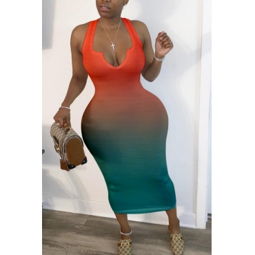 Lovely Sexy Gradual Change Orange Mid Calf Plus Size Dress