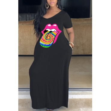 Lovely Leisure V Neck Lip Print Black Maxi Plus Size Dress