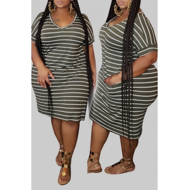 Lovely Casual O Neck Striped Blackish Green Knee Length Plus Size Dress