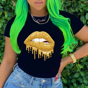 Lovely Casual Lip Print Black T-shirt