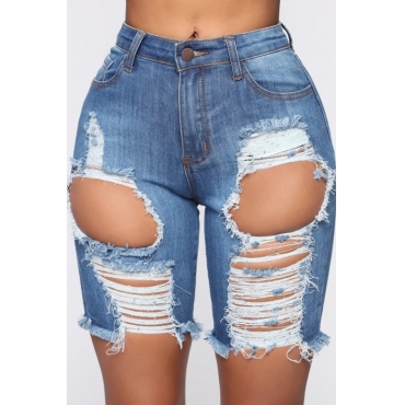 Lovely Casual High-waisted Broken Holes Blue Denim Shorts