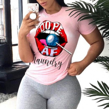 Lovely Leisure O Neck Lip Print Light Pink T-shirt